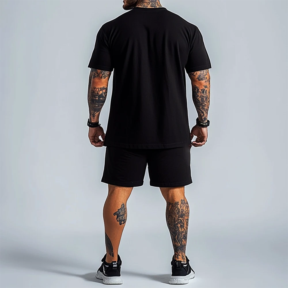 Този екип е създаден за мъже, които ценят качеството и свободата на движение. Състои се от две части: тениска и шорти, които са истинско отражение на вашата активна ежедневие. Тениската е изработена от 100% памук, който осигурява не само мекота при допир, но и издръжливост, благодарение на подсилените двойни шевове на деколтето и ръкавите. С грамаж от 195гр./м2, тя обещава да издържи на времето и интензивните тренировки.